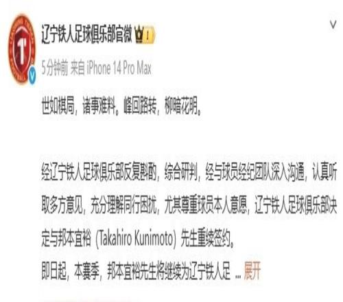 遼寧鐵人在官方公告中,對(duì)于重新簽下邦本宜裕解釋道:經(jīng)俱樂(lè)部反復(fù)斟酌,綜合研判,經(jīng)與球員經(jīng)紀(jì)團(tuán)隊(duì)深入溝通,認(rèn)真聽取多方意見,充分理解同行困擾,尤其尊重球員本人意愿,遼寧鐵人決定與日本外援邦本宜裕重續(xù)簽約。