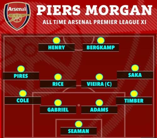 摩根評(píng)槍手歷史最佳陣容,賴(lài)斯、薩卡等現(xiàn)役4人入選引發(fā)熱議